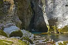 There is a mountain lodge and a small reservoir close to the source of the river. Another nearby building is the former Royal Hunting Lodge built for Alexander I of Yugoslavia and designed in 1932 by Jože Plečnik. The lodge was later used by Yugoslav president Josip Broz Tito and many of his guests. It is now referred to as the Plečnik Manor (Slovene: Plečnikov dvorec).[12] There is also a smaller hunting lodge built on a boulder and also used by Tito. This lodge is called Beautiful Stone (Slovene: Lepi kamen).