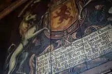 Some "Arras works" mentioned in inventories were a kind of patterned cloth used for bedcovers and wall hangings, which was relatively inexpensive compared with true tapestry, sometimes known as "Arras".[111] Servais de Condé worked in Holyrood Palace for Mary, Queen of Scots in September 1561 lining a cabinet room with 26 ells of a fabric called "Paris Green".[112] The Italian cloth merchant and financier Timothy Cagnioli advanced £500 Scots for the project.[113] A cabinet room for James VI at Stirling Castle, a small space next to king's bedchamber in the palace, was also finished in green.[114] The wealthy merchant John Clerk settled at Newbiggin House at Penicuik, and in 1665 ordered striped wall hangings from a weaver working in Edinburgh's Canongate, James Crommie or Crombie. Clerk had some worset wool thread dyed carnation "in grain" for the hangings.[115]