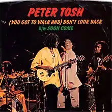Peter Tosh scored a hit in 1978 with a reggae version of the song, sharing vocals with Mick Jagger. That version bore the modified title "(You Gotta Walk And) Don't Look Back".[5] The song hit #1 in the Netherlands, #2 in Belgium,[6] #20 in Australia,[7] and #81 in the US.[8] The song was also featured on the 2007 album Putumayo Presents World Hits starring Jagger and Tosh. This album also contains songs like E'mma from Touré Kunda, 7 Seconds from Youssou N'Dour & Neneh Cherry, "Watermelon Man" from Mongo Santamaría, Oye Como Va From Santana, etc.
