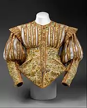 James Hay, 1st Earl of Carlisle wrote about the tight-fitting costumes worn by performers in English court masques, the fashion was "to appear very small in the waist, I remember was drawn up from the ground by both hands whilst the tailor with all his strength buttoned on my doublet".[7]