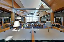 The fourth floor is dedicated to students with their laptops, and the lower floors provide large round tables for people to meet at. All floors except floor 1 provide individual alcoves for students or members of the public who are engaged in research for their studies. Floors 6 and 8 are "quiet study floors" and floor 7 is a "silent study floor".