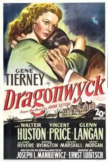 Dragonwyck is a 1946 American period drama film made by Twentieth Century-Fox.[4][5] It was directed by Joseph L. Mankiewicz, and produced by Darryl F. Zanuck and Ernst Lubitsch (uncredited), from a screenplay by Mankiewicz, based on the novel Dragonwyck by Anya Seton. The music score was by Alfred Newman, and the cinematography by Arthur C. Miller. The film stars Gene Tierney, Walter Huston, and Vincent Price.