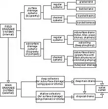 Figure 1 classifies the various types of drainage systems. It shows the field (or internal) and the main (or external) systems.[2] The function of the field drainage system is to control the water table, whereas the function of the main drainage system is to collect, transport, and dispose of the water through an outfall or outlet. In some instances one makes an additional distinction between collector and main drainage systems. Field drainage systems are differentiated in surface and subsurface field drainage systems.