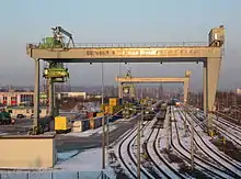 A modern freight village lies immediately south of the station area on Potthoffstraße.[4] The transhipment yard for combined transport has two entry and exit tracks, four loading tracks with adjoining storage areas and two gantry cranes. The transhipment yard can handle a maximum of 90,000 containers or swap bodies annually.
