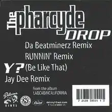 "Drop" is a single by alternative hip hop group The Pharcyde, released in 1995 as the second single for the group's second album, Labcabincalifornia. The single contains a reversed sample of Dorothy Ashby's recording of "Django", originally by the Modern Jazz Quartet, as well as a vocal sample of the Beastie Boys song "The New Style", using the titular "mmm..... drop" line delivered during a drop to create its hook.