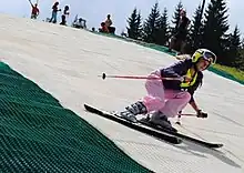 A type of Enoki mushroom dry ski slope surface from China. Countless thin strips with round balls on the top, resembling a mushroom-like shape, make the surface of the run-in slopes of the Training Centre airbag[10] jumps differently from other dry slope surfaces in terms of sliding effect and safety. Its structure, friction, elasticity, safety protection, and simulation effect provide an ideal surface for airbag beginners and high-performance athletes. The surface allows the rider to either carve or skid to aid in speed control or line choice. It is possible to turn on the surface quite well, but the aim is to maintain a low edge angle and make small adjustments to create speed or set your line. This type of dry ski mat appeared for the first time at a FIS World Cup competition.[11]