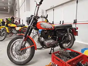 The Road was introduced in 1972 as a Spanish version of the 250 Scrambler.[6][7] However, the model used the longer stroke 'narrow case' engine of the 24 Horas rather than the 'wide case' engine of the Scrambler.[1] A locally built Amal carburettor and Spanish Telesco front forks were fitted.[8] The bike was finished in Black with a metallic burnt orange tank and mudguards and chrome headlight.[1]