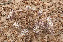This plant is likely pollinated by members of the sand wasp group Bembicinae, and beetle species of Dasytes. Rabbits and small rodents are significant herbivores of the plant, especially consuming it in dry periods. The leaves of the plant are also consumed during the winter growing season. Plants may re-sprout from beneath the soil even if the above-ground parts appear to be dead.[1]
