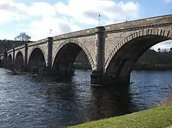 Dunkeld Bridge is a seven-arch bridge crossing the River Tay at Dunkeld, Perth and Kinross, Scotland. It carries the pedestrian and vehicle traffic of Bridge Street (the A923) and connects the parishes of Dunkeld and Dowally to the north and Little Dunkeld to the south.[1] A Category A listed structure,[2] it is 685 feet (209 m) long, 26.5 feet (8 m) wide and 54 feet (16 m) high.[3] Its middle arch is 90 feet (27 m) wide, two others are 84 feet (26 m), two more are 74 feet (23 m) and the land-arches are 20 feet (6 m). The pontage was abolished in 1879.[3]