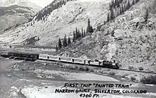After World War II, domestic tourism began to grow across the country and the Silverton branch of the railroad would benefit. Bolstered by national exposure via Hollywood movies being filmed along the line in the late 1940s, the railroad created The Silverton, a summer-only train service, on June 24, 1947.[8] A short time later, the railroad adorned a locomotive and four coaches with a colorful yellow paint scheme and launched modest public promotion. With this effort, "The Painted Train" officially started a new era of tourism that continues to this day. Freight traffic, however, continued to decline, and during the 1950s The Silverton operated as a mixed train.[9]