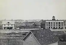 Durham's location is a result of the needs of the 19th century railroad industry. The wood-burning steam locomotives of the time had to stop frequently for wood and water and the new North Carolina Railroad needed a depot between the settled towns of Raleigh and Hillsborough. The residents of what is now downtown Durham thought their businesses catering to livestock drivers had a better future than "a new-fangled nonsense like a railroad" and refused to sell or lease land for a depot.[23] In 1849, a North Carolina Railroad depot was established on a four-acre tract of land donated by Dr. Bartlett S. Durham; the station was named after him in recognition of his gift.[24] A U.S. post office was established there on April 26, 1853, now recognized as the city's official birthday.[24]