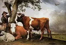 Landscapes with animals in the foreground were a distinct sub-type, and were painted by Cuyp, Paulus Potter (1625–1654), Albert Jansz. Klomp (1625-1688), Adriaen van de Velde (1636–1672) and Karel Dujardin (1626–1678, farm animals), with Philips Wouwerman painting horses and riders in various settings. The cow was a symbol of prosperity to the Dutch, hitherto overlooked in art, and apart from the horse by far the most commonly shown animal; goats were used to indicate Italy. Potter's The Young Bull is an enormous and famous portrait which Napoleon took to Paris (it later returned) though livestock analysts have noted from the depiction of the various parts of the anatomy that it appears to be a composite of studies of six different animals of widely different ages.
