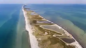 Dzharylhach Island is a long, thin line of sand and shoals, running west-to-east in the bay between the Crimean Peninsula to the south, and the mainland to the north. At times of low water, the shoals can become exposed to join the island as a spit of the mainland. The coastal waters are very shallow, typically less than 1 meter.[3] The characteristic salty soil of the island is called solonetz. The bay is part of the Ramsar site Karkinitska and Dzharylgatska Bays.[3]