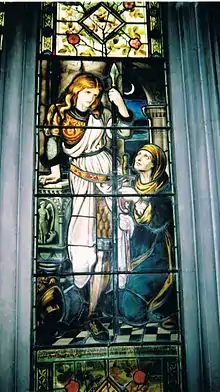 Thomson's stained glass windows can be seen at the Church of St John the Divine, Brooklands in Cheshire, and at Cheltenham Ladies’ College.[3] The Britomart Windows at Cheltenham Ladies’ College are based upon six pictures taken from Edmund Spenser’s allegory of The Faerie Queene. They were produced by Heaton, Butler and Bayne. Thomson designed four of the windows including the Lady Knight and Frederic Shields designed two – the first and the fifth.