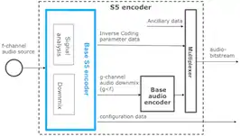 Compressing the downmix audio by a base audio coder further increases the coding efficiency of S5. The various bitstreams produced by the functional units of an S5 encoder may be encapsulated into a single bitstream by the functional unit 'Multiplexer'.