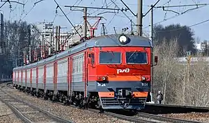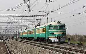 ER2 electric trainset is a DC electric multiple unit which was in production by the Railroad Machinery Plants of Riga (in consortium with the Electrical Machinery Plants of Riga and the Railroad Machinery Plants of Kalinin) from June 1962 to mid-1984. It was essentially an improvement of the ER1 design, featuring footboards for low platforms, and aprons for high platforms, as well as improved electrical equipment and minor changes to the bodywork (specifically, the engineer's cab, side walls, headstocks, and door mountings). Since the mid-1960s, the ER2 has been the most widely used type of suburban train in the Soviet Union and its successor states.