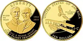 As part of its Modern United States commemorative coins program the United States mint has issued several commemorative eagle coins. In 1984, an eagle was issued to commemorate the Summer Olympics, and another eagle was issued in 2003 to commemorate the Wright brothers first flight at Kitty Hawk. The pre-1933 .900 fine gold standard was restored; this would also be used in half-eagle gold commemoratives as well. The coins would be identical in fineness and size to their pre-1933 counterparts of the same face value. In 2000 a unique eagle, the Library of Congress bimetallic eagle, was issued commemorating the Library of Congress; it consisted of equal weights of an approximately 1/4 oz .9995 fine platinum core and a .900 fine gold outer ring.