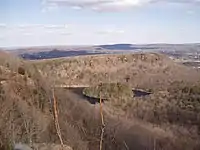 East Peak, 976 feet (297 m), is a prominent basalt traprock mountain in the Hanging Hills of Meriden, Connecticut. Rugged and scenic, the peak rises steeply above the city of Meriden 600 feet (183 m) below and is characterized by its vertical cliffs and sweeping views of southern Connecticut and Long Island Sound. A small stone observation tower known as Castle Craig stands on the summit.