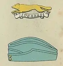 The East Riding of Yorkshire Imperial Yeomanry wore serge khaki uniforms in drill order, with staff cap and brown equipment. The walking out dress comprised a Slouch hat and a serge tunic with blue plastron front, shoulder straps and waistbelt.[12] After it became a lancer unit it adopted full dress uniform with a Chapka lance cap, the upper part covered in light blue cloth, and a tunic of maroon cloth (an unusual colour for the British Army) with light blue plastron, shoulder straps and cuffs. The unit adopted as its badge a running fox and the motto 'Forrard' in recognition of its foxhunting heritage.[22][23][75]