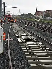 In July 2018, workers started realigning tracks to make way for the construction of the Queens tunnel portal, which was the final major contract not underway at the time.[87] The realignment of the three westbound Main Line and Port Washington Branch tracks, as well as the construction of a new eastbound Main Line track to replace an existing track, were completed by the end of summer 2018.[66]: 26 The last major construction contract—$60 million to move tracks in Harold Interlocking and build a tunnel portal structure for Tunnel B/C—was awarded to Skanska in October 2018.[88][89] Work on the tunnel structure was expected to run from mid-2019 to mid-2021.[90][91] Work on the Midday Storage Yard also progressed, and by 2019, tracks were being laid in the storage yard.[68]: 14–18, 23 The portal for Tunnel B/C was completed by early 2021,[92] and the yard was 99 percent complete by that May.[93]: 9