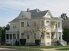 - The Bjoin house at 1001 E. Main Street is a 2-story Italianate-styled house built in the 1880s. The main block is clad in clapboard, with a wide frieze-board and brackets supporting the eaves. Above is a hipped roof with a central deck. A 3-story bay on the west side rises to a tower with a mansard roof. The front porch spans the most of the north side, decorated with spindlework and an elaborate cut-out frieze.[3][4]