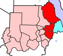 The Eastern Front (Arabic: الجبهة الشرقية, romanized: al-Jabhah al-Sharqīyah) is a coalition of rebel groups operating in eastern Sudan along the border with Eritrea, particularly the states of Red Sea and Kassala. The Eastern Front's Chairman is Musa Mohamed Ahmed. While the Sudan People's Liberation Army (SPLA) was the primary member of the Eastern Front, the SPLA was obliged to leave by the January 2005 Comprehensive Peace Agreement that ended the Second Sudanese Civil War. Their place was taken in February 2004 after the merger of the larger Beja Congress with the smaller Rashaida Free Lions, two tribal based groups of the Beja and Rashaida people, respectively.[1] The Justice and Equality Movement (JEM), a rebel group from Darfur in the west, then joined.
