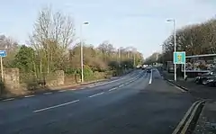 ![]() View looking north towards Eastwood on Thornliebank Road (B769), with green 'Welcome to Glasgow' sign denoting city boundary | |
