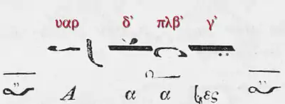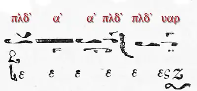 There are different styles by which to notate enechema which are crucial to the understanding of the different chant books and their notation. All these forms were written in red ink. The explicit long form was called by Jørgen Raasted intonation,[1] but only the books of the cathedral rite used such explicit intonations, also between the sections, where these intonations were called medial intonation. This explicit form made sense, since the intonation also communicated the changes between the left and the right choir and their leaders performed these intonations to coordinate these changes. There was a short form as well which was called modal signature. It indicated the echos by the numeral like πλα' for "plagios protos," while the neumes sung with the last syllable of the enechema were written above right to the numeral. This short form was used in two different ways, as main signature it indicated the echos of a whole composition, but especially in sticheraria notators also wrote medial signatures between the neumes above a kolon of the text, in order to indicate that the melos changed here into another echos. The traditional Greek term for these medial signatures was "martyria" (μαρτυρία), since the medial signature also "testified" the phthongos of the cadence made at the kolon.