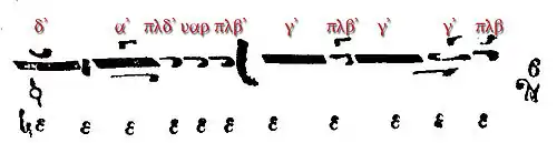 In the first descending half he made the usual cadence on D (πα, phthongos πλα') which corresponds to the finalis of the modern melos, while it was once the finalis and the basis of the plagios protos. The second half, when the melos raises again, but within the papadic melos (used with a cherubikon or koinonikon) it prepared a change to another base tone on the upper tetrachord like a (κε, phthongos α').[6]