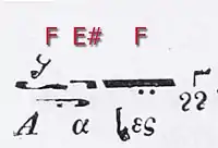 - ↑ For the proper intonation of the enharmonic diesis which is augmented in descending direction, listen to Demosthenis Païkopoulos' interpretation of the echos plagios devteros section in Petros Bereketis' didactic chant (mathema) (24'02").