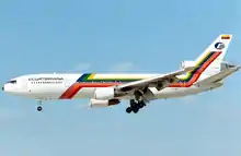 March 2000 saw the airline flying to Buenos Aires, Cancún, Guayaquil, Manaus, Mexico City, Panama City and Santiago using one Airbus A310-300, three Boeing 727-200 Advanced and one McDonnell Douglas DC-10-30.[10] That year, Ecuatoriana was caught up in the aftermath of the collapse of Ecuador's economy and once again found itself in financial trouble, and VASP decided to sell its part of the airline, with both Aero Continente and Lan Chile being bidders at that time.[11] Despite claims that Lan Chile was not interested in Ecuatoriana, the Chilean carrier was operating its own aircraft on behalf of Ecuatoriana on the lucrative routes to the US after Ecuatoriana's aircraft were repossessed by lessors in late 2000.[12] Following the rejection of Aero Continente's bid and the suspension of Ecuatoriana's air operator certificate, Ecuador's civil aviation authority cleared Lan Chile to start up a subsidiary named Lan Ecuador to fly many international routes previously operated by Ecuatoriana.[13][14]