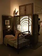 Kienholz occasionally incorporated defunct or operating radios or televisions into their works, sometimes adding sound and moving images to the overall effect. Live animals were selectively included as crucial elements in some installations, providing motion and sound that contrasted starkly with frozen tableaus of decay and degradation. For example, The Wait, a dismal scene of a lonely skeletal woman surrounded by memories and waiting for death, incorporates a cage with a live parakeet cheerfully chirping and hopping about. The bird is considered an integral part of the installation, but requires special attention to ensure that it remains healthy and active, as described in the Whitney Museum's online catalog and video.[15] Another well-known work, The State Hospital, incorporates a pair of black goldfish swimming in each of two glass goldfish bowls representing the head of an inmate suffering with mental illness.[16]