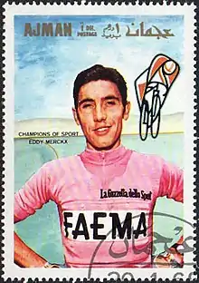 He began the Giro d'Italia on 16 May, stating that he wished to ride less aggressively than the year before in order to save energy for the Tour de France.[63] Merckx had won four of the race's stages and held the race lead going into the sixteenth day of racing.[64] However, before the start of the stage race director Vincenzo Torriani, along with a television camera and two writers, entered Merckx's hotel room and informed him that he had failed a doping control and was disqualified from the race, in addition to being suspended for a month.[65] On 14 June, the cycling governing body, the FICP, overturned the month long suspension and cleared him due to the "benefit of the doubt."[66]