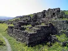 According to some ancient writers, Caranus, the legendary founder of the Argead Dynasty (whose most famous member was Alexander the Great), established the city of Edessa and made it the first capital of ancient Macedon,[3] and later Argead rulers moved Macedon's capital to Aegae and eventually Pella. Archaeological remains have been discovered on the site of ancient Edessa, just below the modern city (40°47'48.48"N 22° 3'26.24"E). The walls and many buildings have been unearthed so far. A colonnade with inscription in Greek dates from Roman times. The city achieved certain prominence in the first centuries AD, being located on the Via Egnatia. From 27 BC to 268 AD it had its own mint. The Orthodox Christian Saint Vassa and her three children were put to death here in the 3rd century AD.[13][14]