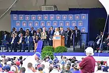 First eligible to be elected into the Hall of Fame in the 2010 Baseball Hall of Fame balloting, and with 75% of the vote required for induction, Martínez received 36.2% of the vote. While some sports writers felt that his batting numbers do not overcome the one-dimensional aspect of his career as a DH, others have compared this to the specialty of closers whose contribution to their teams victories resides on working one inning to preserve an advantage and the fact that these late inning relievers are not involved in other facets of the game such as hitting and base running.[51] By the 2018 Baseball Hall of Fame balloting, his ninth year on the ballot, Martínez's vote total increased to 70.4%. The 2019 ballot, his last chance for election by the Baseball Writers' Association of America, elected him to the Hall of Fame, appearing on 85.4% of the ballots cast.[52][53] He became the second player to enter the Hall of Fame as a Mariner, after Ken Griffey Jr.,[54] and the sixth player to be elected in his final year of eligibility, after Red Ruffing, Joe Medwick, Ralph Kiner, Jim Rice, and Tim Raines.[55] He entered the Hall with the aforementioned Rivera, who was elected in his 1st year of eligibility, along with the late Roy Halladay (1st ballot, posthumous).[52] A statue of Martínez was installed outside Seattle's T-Mobile Park in 2021.