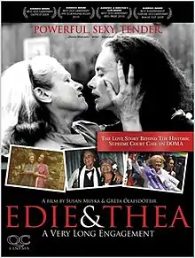 Edie & Thea: A Very Long Engagement is a 2009 American documentary film directed and produced by Susan Muska and Gréta Ólafsdóttir for their company Bless Bless Productions, in association with Sundance Channel. The film tells the story of the long-term lesbian relationship between Edie Windsor and Thea Spyer, including their respective childhoods, their meeting in 1963, their lives and careers in New York City, Thea's diagnosis with multiple sclerosis and Edie's care for her partner, and their wedding in Toronto, Canada, in May 2007, because gay marriage was not then legal in their home state of New York.