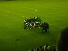 During the 1940 New Year's Day match, Easter Road was covered with a thick fog that would normally cause a football match to be abandoned.[42] Due to the match being played during wartime, and it being broadcast widely by the BBC for the entertainment of soldiers stationed overseas, the War Office ordered play to go ahead to avoid alerting the Luftwaffe to the bad weather conditions.[42] Commentator Bob Kingsley could not see the pitch either and had to improvise.[42] Using a series of runners to tell him if there were any goals scored, he created his own version of the match.[42][43] This was later described in The Scotsman as "Fawlty Towers ahead of itself" and adapted into a BBC Radio Four play by Scottish playwright, Andrew Dallmeyer.[43]