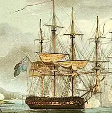 Cooke then served as an aide to Sir George Keith Elphinstone, who was appointed governor during the ensuing Siege of Toulon, and escaped in December when the city was evacuated ahead of the advancing Republican armies. For his services, Cooke was promoted to post captain, participating at the Siege of Calvi under the command of Captain Horatio Nelson. In 1794 Cooke was given command of the 40-gun frigate HMS Sybille, recently captured from the French at the Battle of Mykonos. He took Sybille to the Cape of Good Hope and then eastward into the Indian Ocean as a convoy escort under the command of Rear-Admiral Peter Rainier. In 1798, accompanied by HMS Fox, Sybille entered the port of Manila in the Spanish Philippines disguised as a French ship and convinced the defenders to come alongside peacefully, thus seizing three gunboats and 200 prisoners of war, who were later released after being questioned. The Raid on Manila secured a considerable amount of valuable information.[1]