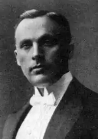 In July/August 1914, Bogoljubow played in the Mannheim tournament (the 19th DSB Congress), and tied for 8–9th in that event, which was interrupted by World War I.[9] After the declaration of war against Russia, eleven "Russian players" (Alekhine, Bogoljubow, Fedor Bogatyrchuk, Alexander Flamberg, N. Koppelman, Boris Maliutin, Ilya Rabinovich, Peter Romanovsky, Peter Petrovich Saburov, Alexey Selezniev, Samuil Weinstein) from the Mannheim tournament were interned by Germany. In September 1914, four of the internees (Alekhine, Bogatyrchuk, Saburov, and Koppelman) were allowed to return home via Switzerland. The remaining Russian internees played eight tournaments, the first held in Baden-Baden (1914) and all the others in Triberg im Schwarzwald (1914–1917). Bogoljubow took second place (behind Alexander Flamberg) in Baden-Baden, and won five times in Triberg (1914–1916). During this time he met Frieda Kaltenbach, daughter of a schoolteacher. They married in 1920 and had two daughters.[5] Bogoljubow spent most of the rest of his life in Germany.