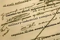 Although it was much broader, Eisenhower's speech is remembered primarily for its reference to the military-industrial complex.[6] The phrase gained acceptance during the Vietnam War era and 21st-century commentators have expressed the opinion that a number of the fears raised in his speech have come true.[7][8][9][10] The speech has been adapted as an oratory for orchestra and orator.[11] The speech was depicted in the opening of the 1991 film JFK.[12]