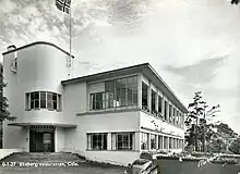 The Functionalist building was first completed in 1929, drawn by architect Lars Backer. The restaurant has flat roofs, large windows, a terrace and an arched entrance in a corner tower. The architect maximized the number of window seats.[1]