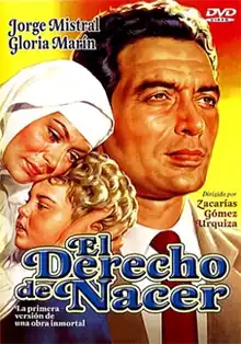 El derecho de nacer ("The Right to Be Born") is a 1952 Mexican film directed by Zacarías Gómez Urquiza and starring Gloria Marín, Jorge Mistral and Martha Roth.[1] based on a Cuban radionovela (radioplay)[2] of the same name by Félix B. Caignet.[3] The movie broke box office records in Mexico when it was first released; during its release in Mexico City in June 1952, it was shown at the downtown Cine Orfeón for seven straight weeks.[1]