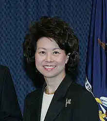 Elaine Lan Chao (born March 26, 1953) is an American businesswoman and former government official who served as United States secretary of labor in the administration of George W. Bush from 2001 to 2009 and as United States secretary of transportation in the administration of Donald Trump from 2017 to 2021. A member of the Republican Party, Chao was the first Asian American woman to serve in a presidential cabinet or as secretary of transportation.[3][4]