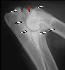 Elbow dysplasia is a condition involving multiple developmental abnormalities of the elbow-joint in the dog, specifically the growth of cartilage or the structures surrounding it. These abnormalities, known as 'primary lesions', give rise to osteoarthritic processes.[1] Elbow dysplasia is a common condition of certain breeds of dogs.