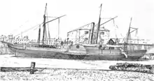 The Monarch was the first ship to be permanently fitted out as a cable ship and operated on a full-time basis by a cable company, although the fitting out for the Netherlands cables was considered temporary.[36] She was a paddle steamer built in 1830 at Thornton-on-Tees with a 130 hp engine.[37] She was the first of a series of cable ships named Monarch.[38]