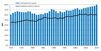 However, due to reducing demand in the late-2000s recession removing any medium term gap, and high gas prices, in 2011 and 2012 over 2 GW of older, less efficient, gas generation plant was mothballed.[35][36] In 2011 electricity demand dropped 4%, and about 6.5 GW of additional gas-fired capacity is being added over 2011 and 2012. Early in 2012 the reserve margin stood at the high level of 32%.[37]