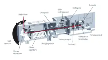 Electron transfer dissociation takes place in an ion trap mass spectrometer with an electrospray ionization source. The first ETD experiments at the University of Virginia utilized a radio frequency quadrupole linear ion trap (LQT) modified with a chemical ionization (CI) source at the back side of the instrument (see diagram at right).[10] Because a spectrum can be obtained in about 300 milliseconds, liquid chromatography is often coupled with the ETD MS/MS.[11] The disadvantage of using LQT is that the mass resolving power is less than that of other mass spectrometers.[14]