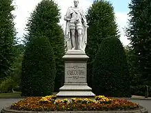 Grosvenor continued the family interest in horse racing[1] and, when he was living in the country estate, he spent time hunting and fishing.[2] He gave generously to charity, and built and restored churches.[1] He was an early patron of the Chester architect John Douglas.[10] In 1865–66 Douglas designed St John's Church for him in his estate village of Aldford.[8] About the same time, Grosvenor gave fields in Chester to the city council for the formation of Grosvenor Park.[11] For this park Douglas designed a number of items, including the Entrance Lodge, the gates, and a cover for Billy Hobby's Well.[8] In 1865 the citizens of Chester began to raise money for the erection of a statue "to mark the public and private worth of his lordship, and the high estimation in which he is held by his neighbours and tenants, as well as by all classes of the community". Over £5,000 (equivalent to £510,000 as of 2021)[12] was raised. The statue showing the marquess in his Garter robes was designed by Thomas Thornycroft, and erected in 1869; it still stands in Grosvenor Park.[11]