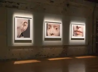 King's later shows placed her sculptures in a widening range of contexts—custom vitrines, display cases also housing her source materials, multimedia installations—that used minimal means to convey emotional and psychological nuance: subtle movement, acute attention to pose, spare lighting and careful composition.[25][12][44] These elements especially came into play when she began to "cast" her figures in photographic series and stop-frame animations involving painstaking pose adjustments in which they performed self-reflexive movements or simple tasks.[25][45][2] These subtle, involuntary gestures—attuned to slight shifts in the tilt of the head or the touching of fingers, which can variously signal cognition, introspection, suspicion, or resignation, for example—often revealed ways the body unconsciously responds when the mind is active.[11][16][9]