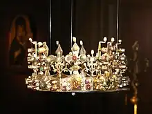 An agreement was reached between Elizabeth's and Polish delegates in Sieradz on 26 February 1383.[32] The queen dowager thereby proposed her youngest daughter Hedwig as Louis' successor in Poland,[31][33] and absolved the Polish nobles from their 1382 oaths to Mary and Sigismund.[32][33] She agreed to send Hedwig to be crowned in Kraków but requested that, in view of her age, she spend three more years in Buda following the ceremony. The Poles, entangled in a bloody civil war, initially conceded to the requirement, but soon found it unacceptable for their monarch to reside abroad for so long. At the second meeting in Sieradz, held on 28 March, they contemplated offering the crown to Hedwig's distant relative, Duke Siemowit IV of Masovia.[33] They eventually opted against it, but at the third Sieradz meeting, on 16 June, Siemowit himself decided to lay claim to the crown. Elizabeth reacted by having an army of 12,000 men devastate Masovia in August, forcing him to drop his pretensions.[34] Meanwhile, she realized that she could not expect the nobles to accept her request and instead resolved to delay Hedwig's departure. Despite continuous Polish demands to expedite her arrival, Hedwig did not move to Kraków until the end of August 1384.[35] She was crowned on 16 October 1384.[36][37] No regent was appointed, and the 10-year-old exercised her authority according to the advice of Kraków magnates.[38] Elizabeth never saw her again.[39]